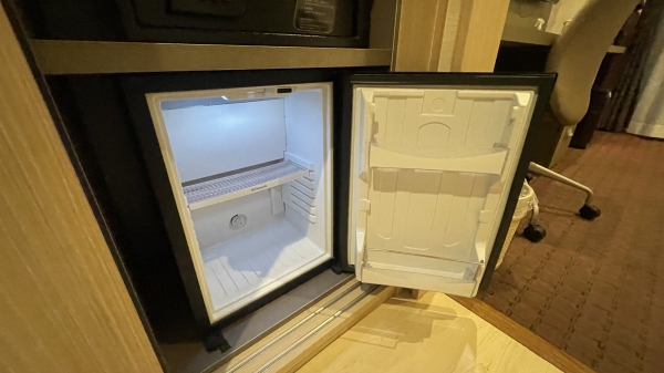 ベッドの反対側には荷物置きにも使える広いデスクがあり、ズボンプレッサーや空気清浄機、身支度をしやすい大きな鏡が付いたワークスペースがあります。