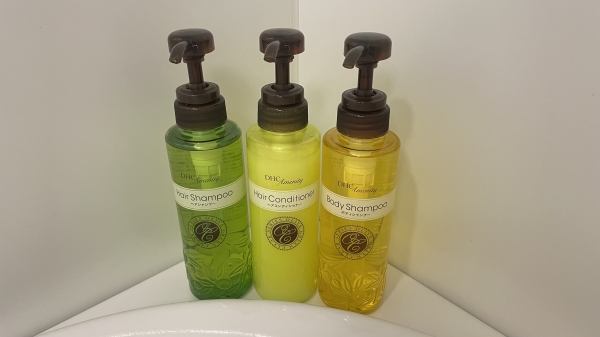 シャンプー、コンディショナー、ボディソープはDHCのもの。