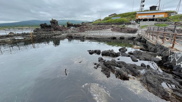 仙法志御崎公園(せんほうしみさきこうえん)には大型バスも停まれる大きめな駐車場があり、駐車場から下っていくと、プールのような囲いのある場所に着きます。