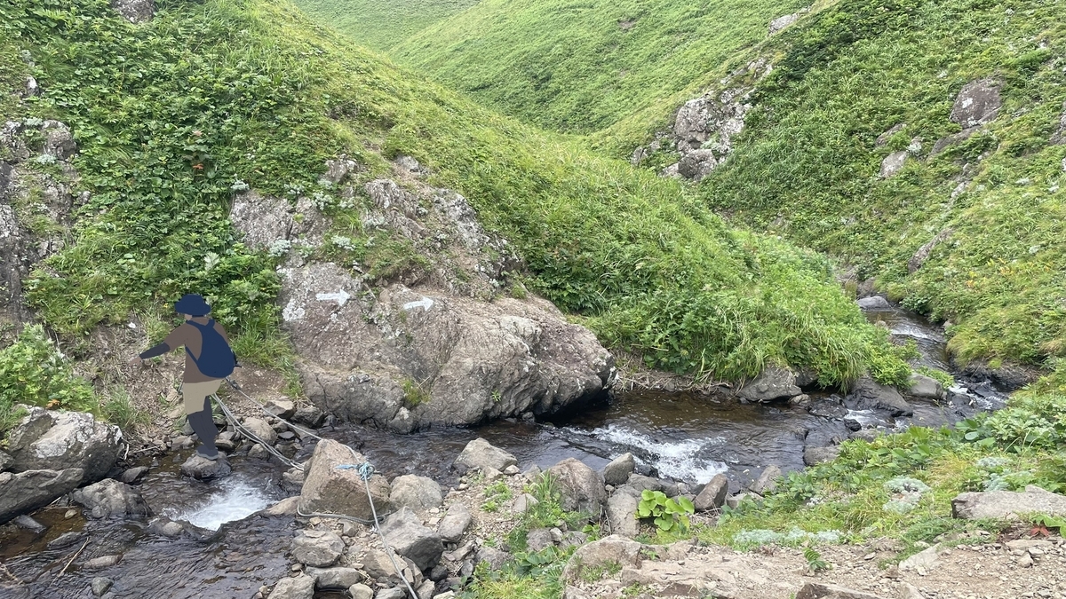 靴は普通のスニーカーでも歩けなくはないですが、このような沢を渡らなければいけないので、防水でグリップ力のあるトレッキングシューズがあると便利です。